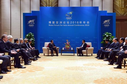 国务院总理李克强在海南博鳌会见博鳌亚洲论坛理事长福田康夫和理事会部分成员。