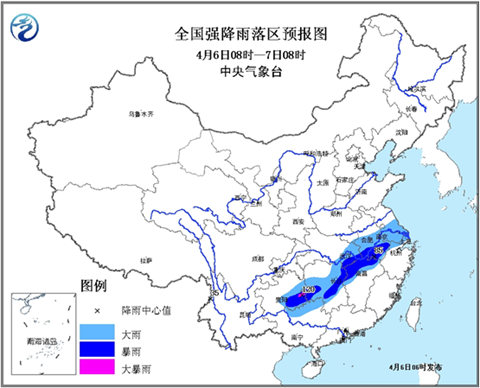 中央气象台4月6日06时继续发布暴雨蓝色预警: