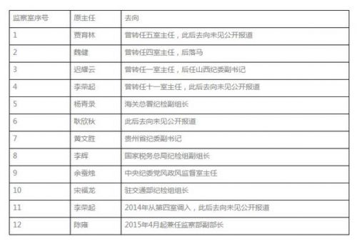 从2013年第一次调整结束后到现在,不到三年时间,这12个纪检监察室的11个主任都已换人,另外一人升任监察部副部长并兼任纪检监察室主任。