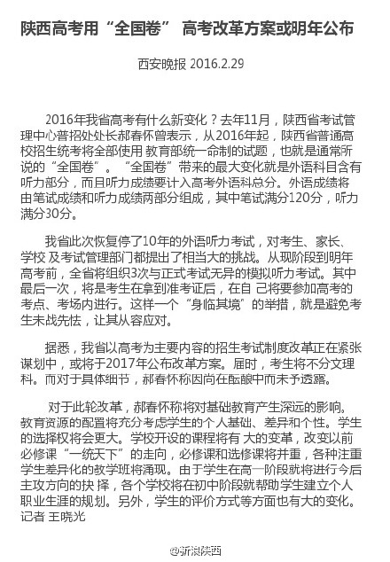 前言:陕西高考改革方案2016年统一实施全国卷,外语成绩将由笔试成绩和听力成绩组成,笔试120分,听力30分。陕西高考改革方案恢复停了10年的外语听力,讲给考生一个挑战。从现阶段到明年高考前,全省将组织3次与正式考试无异的模拟听力考试。via西安晚报