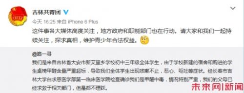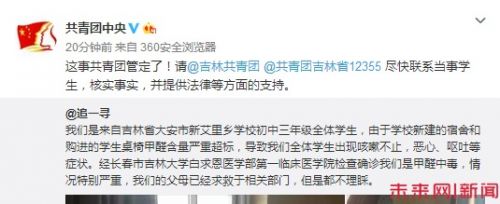 @吉林共青团关注“吉林学生甲醛中毒”一事。图为吉林共青团官方微博截图。
