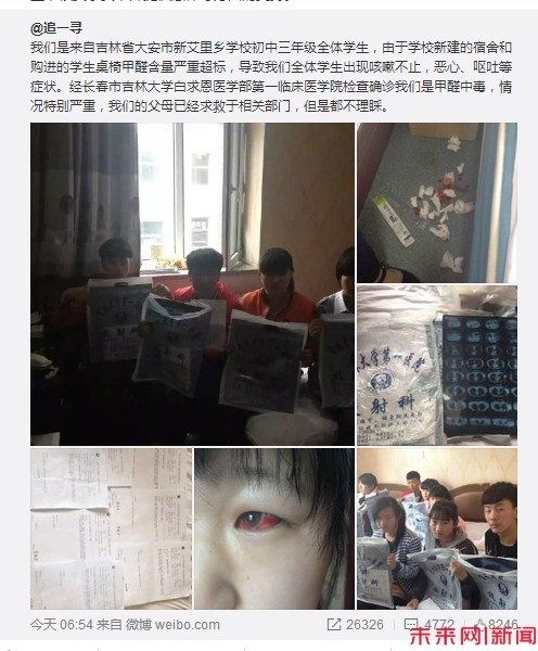 9日,一则“我们是来自吉林省大安市新艾里乡学校初中三年级全体学生,由于学校新建的宿舍和购进的学生桌椅甲醛含量严重超标,导致我们全体学生出现咳嗽不止,恶心、呕吐等症状。经长春市吉林大学白求恩医学部第一临床医学院检查确诊我们是甲醛中毒,情况特别严重,我们的父母已经求救于相关部门,但是都不理睬。”据微博中的照片,有学生眼睛充血;地上也落满了沾满血渍的卫生纸,疑似有学生流鼻血。微博消息发出后,引发了网友的广泛关注。