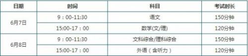 2016年高考各科目考试时长及安排如下: