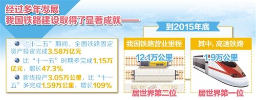 在规划整体布局之下,经过多年发展,我国铁路建设取得了显著成就。到2015年底,我国铁路营业里程达到12.1万公里,居世界第二位。其中,高速铁路1.9万公里,居世界第一位。