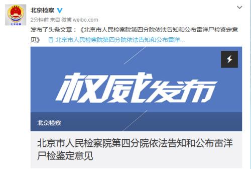 中新网6月30日电 北京市人民检察院官方微博今日通报,称确定死者雷洋符合胃内容物吸入呼吸道致窒息死亡。