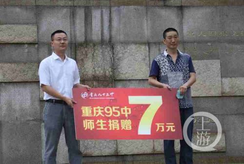 前日在学校散学典礼上,95中举行了为杨亚军同学献爱心捐款仪式。大渡口红十字会副会长陈松涛(图左)把凝聚95中教师、学生和家长浓浓爱心的7万元善款转交给杨亚军的父亲。