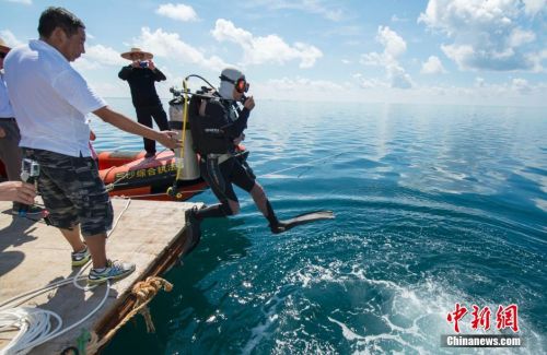 图为海洋专家穿潜水服对三沙永乐龙洞进行水下探查。中新社记者骆云飞摄