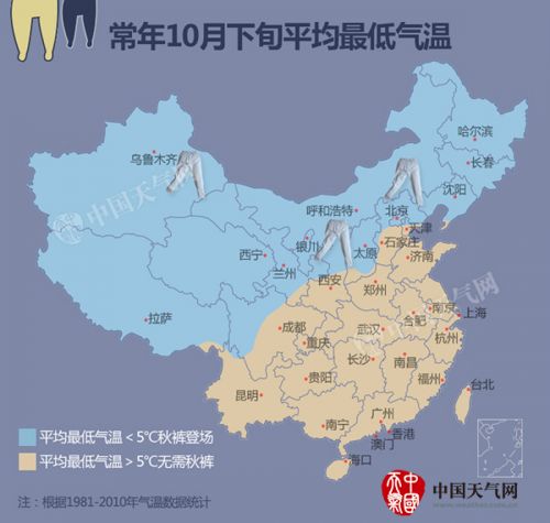 秋裤君每年秋冬季节出来刷存在感,也刷出一定的节奏感了。根据1981-2010年的气候统计,一般到了10月下旬,我国北方大部地区包括西北大部、东北地区以及华北地区,平均最低气温都低于5℃,这个时节最低气温基本稳定在5℃以下,秋裤党开始大范围登场。