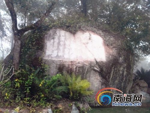 5、12月9日,记者在五指山自然保护区旅游景区梦仙楼前看到,在一块曾有朱明国题词的大石头上,题词已被人用水泥覆盖住。据附近工作人员介绍,以前曾有不少游客在这里照相留念,大石头上的题词是在媒体报道朱明国被调查后的第二天就被人抹掉了。图为朱明国在五指山自然保护区旅游景区大石头上的题词被抹掉。
