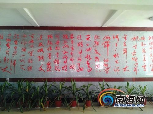 6、在五指山市畅好乡政府大厅内,有乡政府搬迁时朱明国书写的《沁园春·雪》巨幅书法依然赫赫在目,只是落款被两个大铁柜遮挡住。当记者拍照时,一位乡纪委干部告诉记者,乡里正在向市里相关部门打报告请示如何处理这些题词。图为朱明国为五指山畅好乡政府乔迁时题写书法《沁园春·雪》 ,目前仍挂在乡政府大厅。