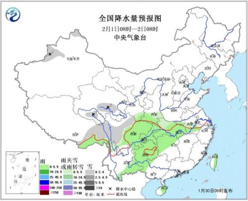 图3 全国降水量预报图(1月31日08时-2月1日08时)