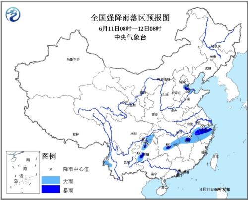 预计,11日8时至12日8时,湖南中部、江西北部、安徽南部、浙江中北部、重庆南部、贵州北部和西南部、云南西部、天津南部、河北东部、山东西北部等地的部分地区有大雨或暴雨(50~90毫米);上述部分地区并伴有短时强降水、雷暴大风或冰雹等强对流天气,最大小时雨强可达20~40毫米,局地超过50毫米。