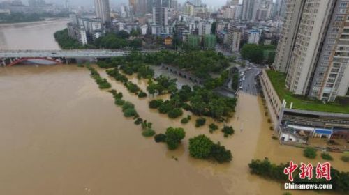 7月3日,因受连日暴雨影响,广西柳江河柳州段出现超警戒水位。图为沿江路段树木几乎被洪水淹没过树顶。 王以照 摄