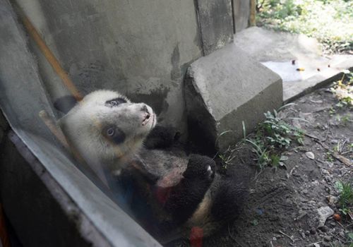 它现在最喜欢的娱乐是在墙角蹭痒痒,玩泥巴,把自己弄得灰头土脸。其余的时候,它在吃饭、发呆、睡觉、盯着自己的熊掌,一看半天。