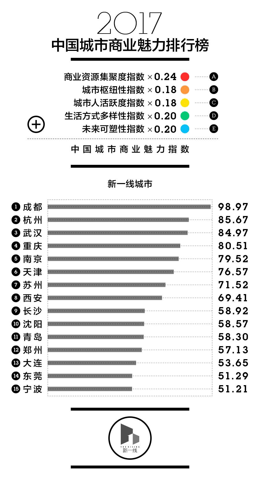 以此综合计算得到的结果是,北上广深4个一线城市的地位依然不可动摇,但15个"新一线"城市的席次有了一些改变,依次是成都、杭州、武汉、重庆、南京、天津、苏州、西安、长沙、沈阳、青岛、郑州、大连、东莞和宁波。