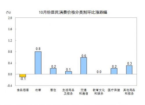 10月份,全国居民消费价格环比上涨0.2%。其中,城市上涨0.2%,农村上涨0.2%;食品价格下降0.3%,非食品价格上涨0.3%;消费品价格上涨0.3%,服务价格持平。