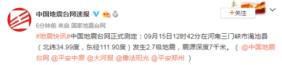 河南三门峡渑池县发生2.7级地震 震源深度7千米 中国地震台网 2019-09-15 16:43 #地震快讯#中国地震台网正式测定:09月15日12时42分在河南三门峡市渑池县(北纬34.99度,东经111.90度)发生2.7级地震,震源深度7千米。( @中国地震台网 @平安中原 @大河报 @豫法阳光 @平安郑州 )