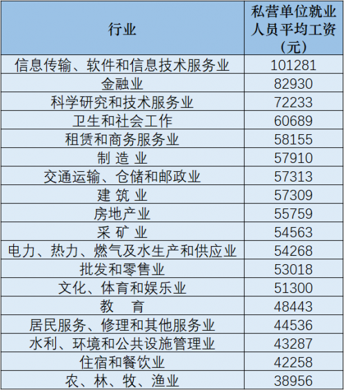 从私营单位就业人员平均工资来看,排在前三位的分别是“信息传输、软件和信息技术服务业”“金融业”“科学研究和技术服务业”。排名后三位的分别是“水利、环境和公共设施管理业”“住宿和餐饮业”“农、林、牧、副、渔业”。