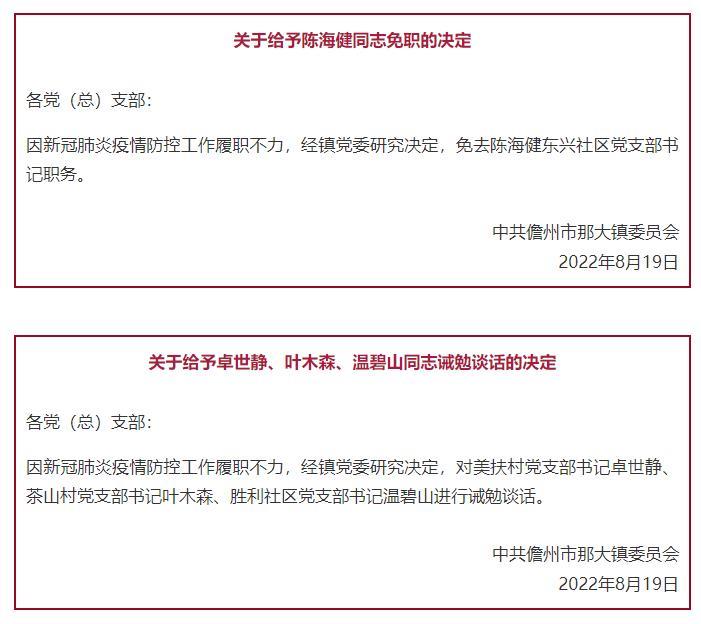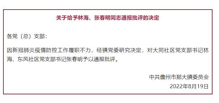 因疫情防控工作履职不力,海南儋州那大镇多名干部被问责! 央视新闻客户端 2022-08-20 17:24 8月20日,海南儋州市委宣传部发布消息,因新冠肺炎疫情防控工作履职不力,海南儋州那大镇多名干部被问责,详情如下: