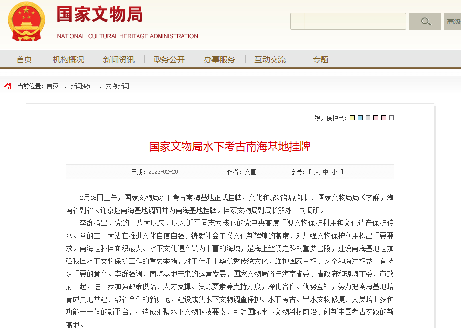文化和旅游部副部长、国家文物局局长李群表示,南海是我国面积最大、水下文化遗产最为丰富的海域,是海上丝绸之路的重要区段。国家文物局将努力把南海基地培育成央地共建、部省合作的新典范,建设成集水下文物调查保护、水下考古、出水文物修复、人员培训多种功能于一体的新平台,打造成汇聚水下文物科技要素、引领世界水下文物科技前沿、创新中国考古实践的新高地。