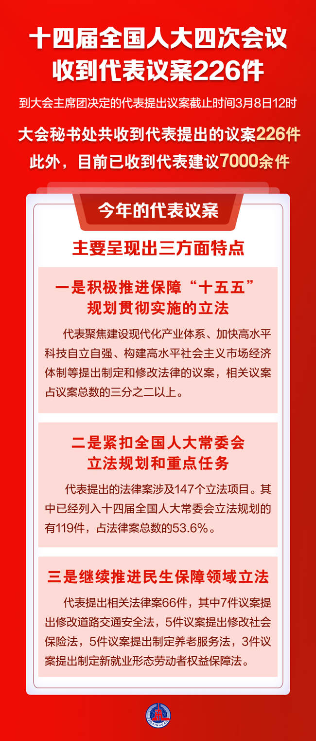 据了解,今年的代表议案主要呈现出三方面特点:一是积极推进保障“十五五”规划贯彻实施的立法。代表聚焦建设现代化产业体系、加快高水平科技自立自强、构建高水平社会主义市场经济体制等提出制定和修改法律的议案,相关议案占议案总数的三分之二以上。二是紧扣全国人大常委会立法规划和重点任务。代表提出的法律案涉及147个立法项目。其中已经列入十四届全国人大常委会立法规划的有119件,占法律案总数的53.6%。三是继续推进民生保障领域立法。代表提出相关法律案66件,其中7件议案提出修改道路交通安全法,5件议案提出修改社会保险法,5件议案提出制定养老服务法,3件议案提出制定新就业形态劳动者权益保障法。