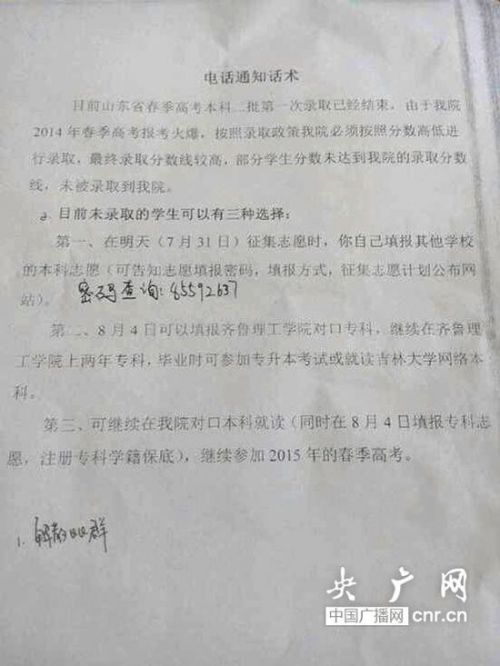 据了解,在代填志愿被曝光后,齐鲁理工学院向各学院老师下发了一份《电话通知话术》,话术中这样表述:“由于我院2014年春季高考报考火爆,按照录取政策我院必须按照分数高低进行录取,最终录取分数线较高,部分学生未达到我院录取分数线,未被录取到我院。”