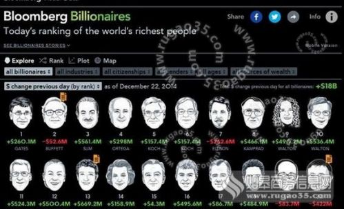 彭博亿万富豪指数:Top1比尔·盖茨;Top2巴菲特;Top3墨西哥电信大亨卡洛斯?斯利姆?埃卢;Top4Inditex集团创始人阿曼西奥·奥特加;Top5大卫-科赫;Top6威廉·科赫;Top7甲骨文公司总裁兼首席执行官拉里·埃里森;Top8宜家家居创始人英瓦尔·坎普拉德;Top9和Top10沃尔玛总裁吉姆·沃尔顿;Top11罗伯·沃尔顿;Top12艾丽斯·沃尔顿;Top13扎克伯格;Top14贝当古夫人;Top15路易威登集团主席兼首席执行官伯纳德-阿尔诺;Top16谷歌创始人兼CEO拉里·佩奇;Top17H&M创始人斯蒂芬·佩尔森;Top18谷歌联合创始人谢尔盖-布林;Top19长和系主席李嘉诚;Top20马云。