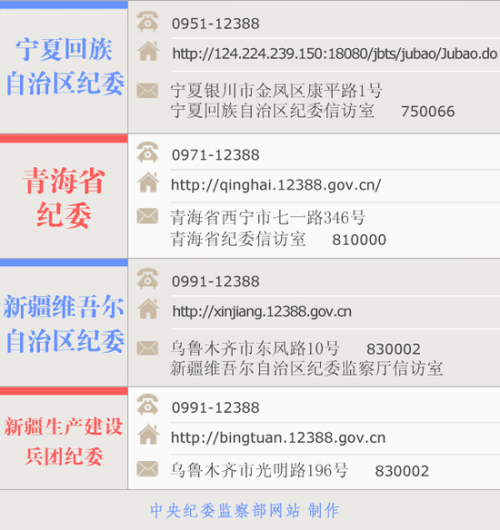 中纪委公布全国各省市纪委联系电话、地址及举报网站(图) 2015-01-04 09:53 来源:中新网 13 公布各地纪委电话和举报地址,并明确纪检监察机关信访举报受理范围。 中纪委公布全国各省市纪委联系电话、地址及举报网站 余下全部 上一页 1 234下一页
