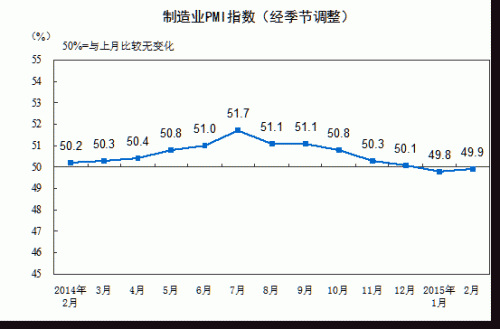 中新网3月1日电 据国家统计局网站消息,2015年2月,中国制造业采购经理指数(PMI)为49.9%,比上月微升0.1个百分点,表明制造业收缩幅度收窄。