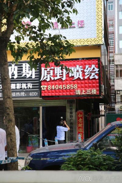 案发现场为三楼这家名为原野喷绘的公司。