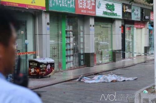 事发现场,当事人尸体已经被遮盖。地面上遍布碎玻璃和血迹。
