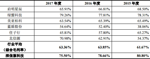 深信服科技2014年至2017年毛利率分别为84.29%、80.80%、78.66%、75.50%。同行业公司分别为启明星辰、绿盟科技、美亚柏科、蓝盾股份、任子行、北信源。行业平均值分别为66.01%、61.67%、63.85%、63.36%。