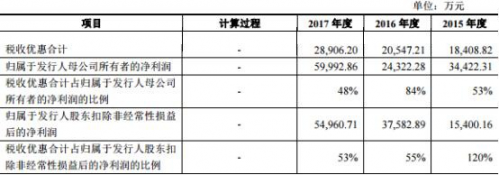 税收优惠占归母净利润比例高:2016年占84% 2017年占48%