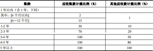 6个月内计提比例为2%,6-12个月计提比例为15%,1-2年计提比例为30%,2-3年计提比例为70%,3-4年、4-5年、5年以上计提比例均为100%。