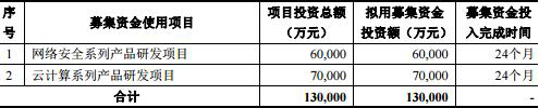 1. 网络安全系列产品研发项目,项目投资总额60,000万元,拟用募集资金投资额60,000万元;2.云计算系列产品研发项目,项目投资总额70,000万元,拟用募集资金投资额70,000万元。