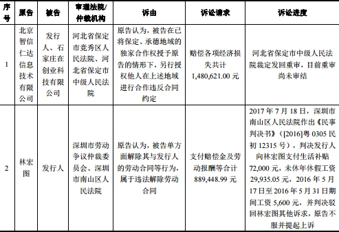 招股书显示,报告期内深信服科技存在1起合同纠纷,原告为北京智信仁达信息技术有限公司,被告为深信服科技、石家庄在创业科技有限公司。