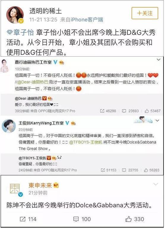 稍早前,“D&G设计师被曝辱华”引起广泛关注。事情发生后,包括陈坤、李冰冰、迪丽热巴、王俊凯、木子洋、火箭少女全体成员、陈学冬、张慧雯、唐艺昕、章子怡等人以及受邀参演此次上海大秀的24位东方宾利模特,已集体宣布不出席或是罢演,等待官方给予更多的解释与道歉。