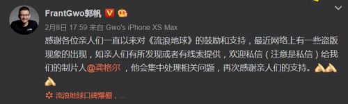 然而,2月8日晚间,影片《流浪地球》导演郭帆发布微博称,最近网络上有一些盗版现象出现,如有所发现或者有线索提供,欢迎私信给制片人龚格尔。影片大卖却无心庆祝的郭帆此言一出,春节档盗版泛滥一事被搬上了明面。
