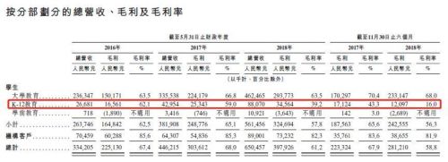 数据显示,新东方在线的毛利率及净利率在2017财年小幅上升,但2018财年至今进入下滑通道。截止2018年11月30日,公司的毛利率为58.8%,较2017年同期下滑了9.1个百分点,净利率为7.6%,较上年同期相比下滑19.8个百分点。其中,K-12教育的毛利率由2016财年的62.1%下降至2018年11月30日的16%,是目前新东方在线毛利率下滑较为严重的业务。