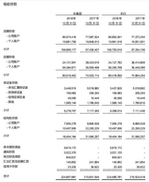 2018年,河北银行存款总额为2248.98亿元,上年同期为2108.32亿元,同比增长6.67%。其中,活期存款为1068.56亿元,上年同期为974.36亿元;定期存款为805.16亿元,上年同期为749.33亿元;保证金存款为52.79亿元,上年同期为71.17亿元;结构性存款为184.04亿元,上年同期为310.66亿元。