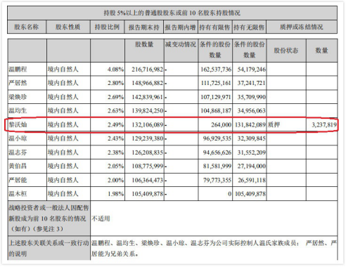 截至2019年上半年末,温氏股份主要股东中,仅一人进行了股份质押。第五大股东黎沃灿质押了323.78万股。此外,温氏股份主要股东中,温鹏程、温均生、梁焕珍、温小琼、温志芬为公司实际控制人温氏家族成员;严居然、严居能为兄弟关系。