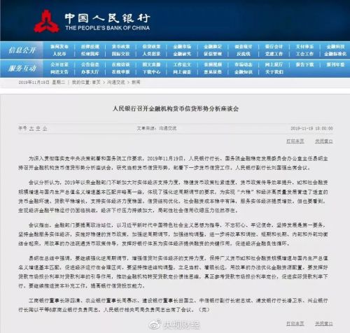 11月19日,央行行长、国务院金融稳定发展委员会办公室主任易纲主持召开金融机构货币信贷形势分析座谈会,研究当前货币信贷形势,部署下一步货币信贷工作。这是继去年11月以来,央行再度召开货币信贷形势分析座谈会。