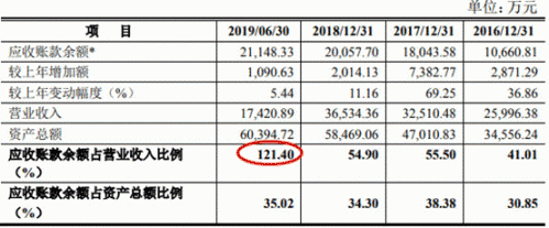 天迈科技业绩向上背后,应收账款占营收比重连续两年超50%,2019年上半年则超100%。2016年至2019年1-6月,天迈科技应收账款余额分别为1.07亿元、1.80亿元、2.01亿元、2.11亿元;占营业收入比例分别为41.01%、55.50%、54.90%、121.40%。