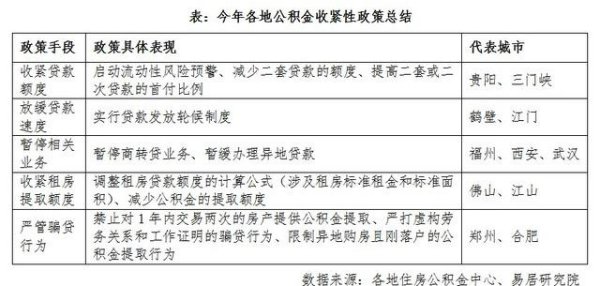 报告指出,公积金流动性不足的问题,会使得公积金的贷款出现各类压力。从公积金贷款可持续和平稳性的角度出发,公积金贷款市场确实需要积极管控和引导。近期全国部分城市纷纷收紧了公积金贷款等政策,形成了非常好的政策效应和市场预期。总结相关政策,报告认为,公积金收紧的调控手段主要包括五种模式,即收紧贷款额度、放缓贷款速度、停止相关业务、收紧租房提取额度、严管骗贷行为等。相关政策具体表现和代表城市总结如下。