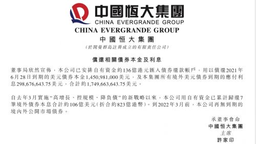 近期恒大就发布了公告,公司安排自有资金约136亿港元汇入债券还款账户,用以偿还今年6月28日到期的14.5亿美元债,以及所有境外美元债到期的应付利息近3亿美元,合计约17.5亿美元。