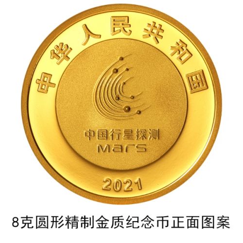 8克圆形金质纪念币背面图案为“祝融号”火星车,衬以火星表面环境组合设计,并刊“中国首次火星探测任务成功·天问一号”字样及面额。