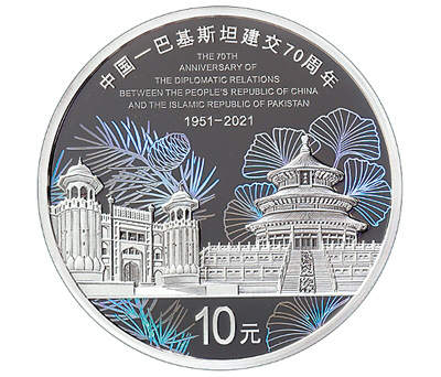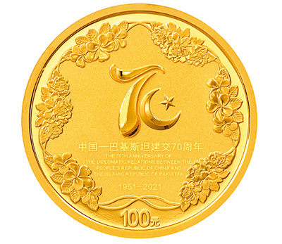 背面图案各有不同。8克圆形金质纪念币背面图案为中国—巴基斯坦建交70周年纪念活动徽标,衬以牡丹花、素馨花等装饰造型组合设计,并刊“中国—巴基斯坦建交70周年”中、英文字样,“1951—2021”字样及面额。30克圆形银质纪念币背面图案为中国的天坛祈年殿建筑、巴基斯坦的拉合尔古堡建筑,衬以银杏树、喜马拉雅雪松枝叶等装饰造型组合设计,并刊“中国—巴基斯坦建交70周年”中、英文字样,“1951—2021”字样及面额。