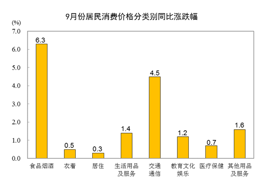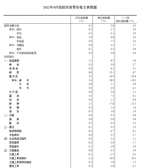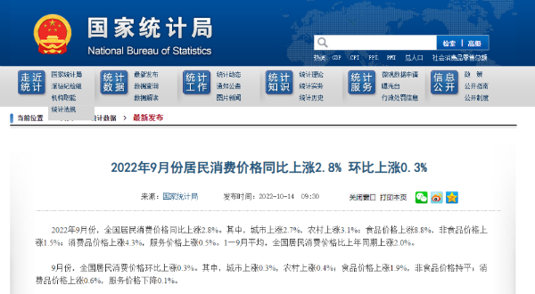 国家统计局:9月份居民消费价格同比上涨2.8% 环比上涨0.3%