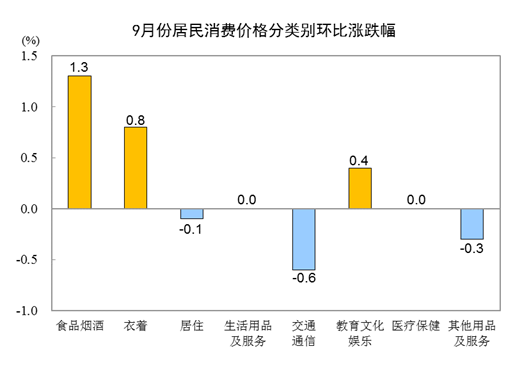 9月份,全国居民消费价格环比上涨0.3%。其中,城市上涨0.3%,农村上涨0.4%;食品价格上涨1.9%,非食品价格持平;消费品价格上涨0.6%,服务价格下降0.1%。
