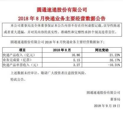 快递行业的竞争越来越大,给加盟制快递企业造成了不小的竞争压力。圆通发布的数据显示,2018年8月份快递产品单票收入3.27元,同比下降10.31%。